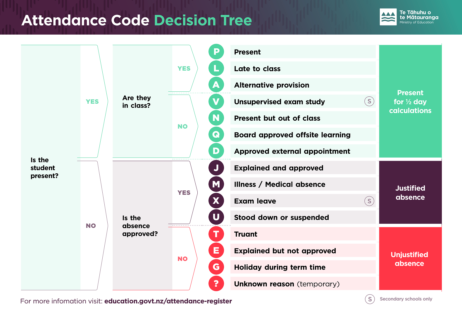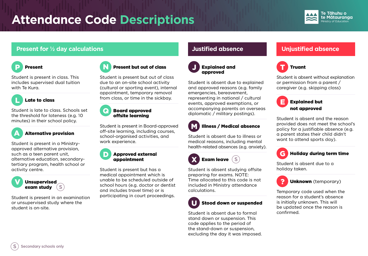 At Willow Park School we follow Ministry guidelines and use specific codes when recording attendance and absences onto HERO. Absences can be either justified (e.g., for medical reasons) or unjustified (e.g., for an unapproved holiday or other reasons).